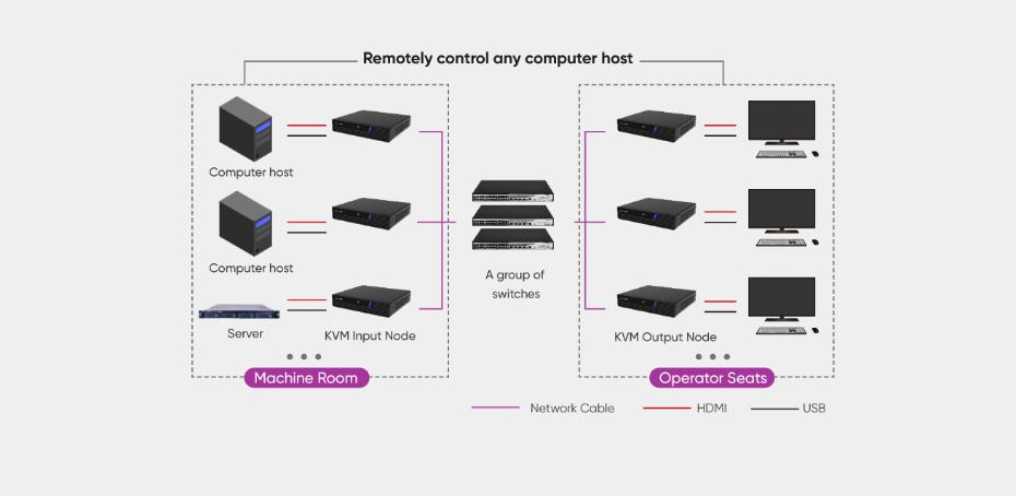 La ubicación central de hosts y servidores de PC en la sala de máquinas mientras los operadores monitorean desde sus escritorios mejora la seguridad de los datos y la propiedad.