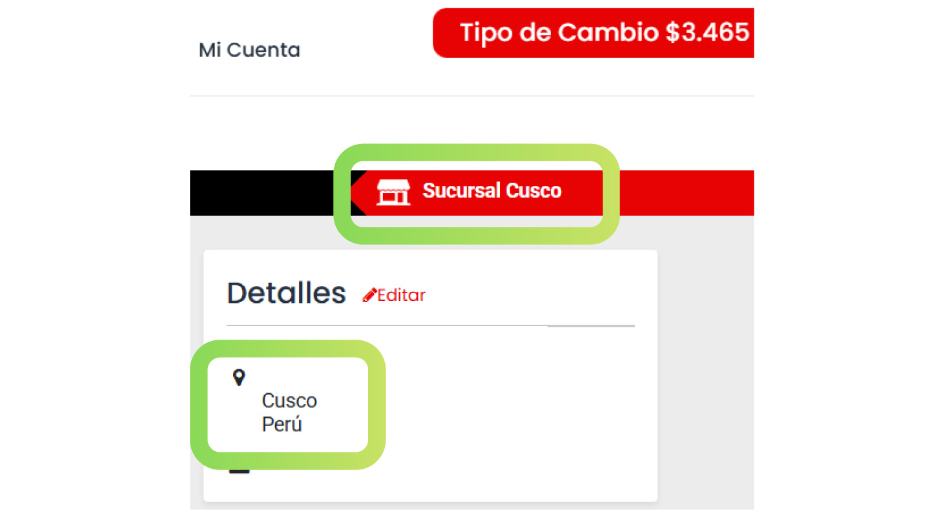 - Identificación de la sucursal: Observa el ícono con el nombre de la sucursal. En este ejemplo, la dirección registrada corresponde a Cusco, por lo que el sistema muestra como referencia la Sucursal Cusco.