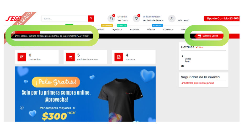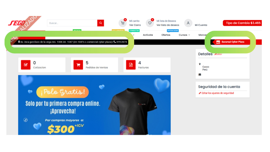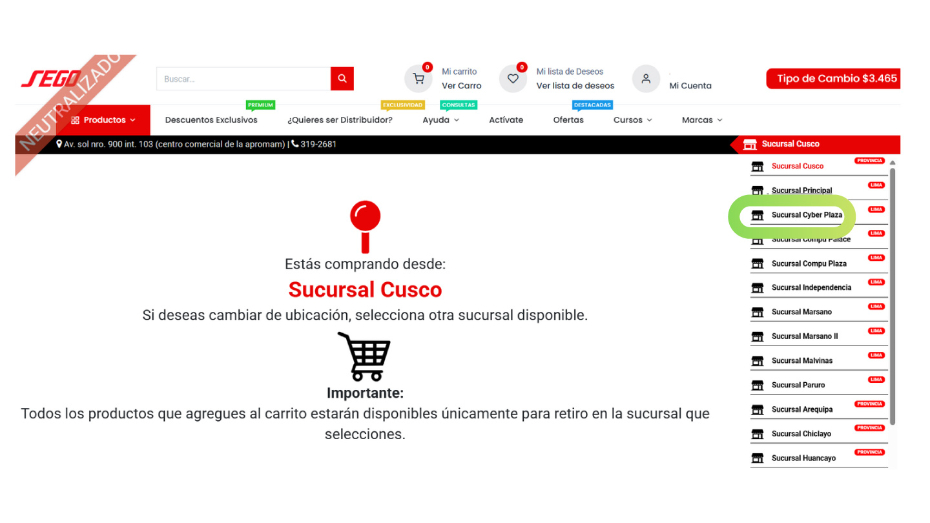A continuación, cambiaremos de sucursal. Actualmente nos encontramos en la Sucursal Cusco; sin embargo, como estamos en Lima y queremos realizar una compra para recoger en una sucursal de Lima, en este ejemplo seleccionaremos la Sucursal Cyberplaza.