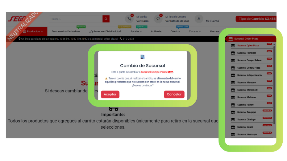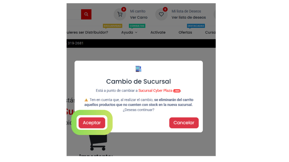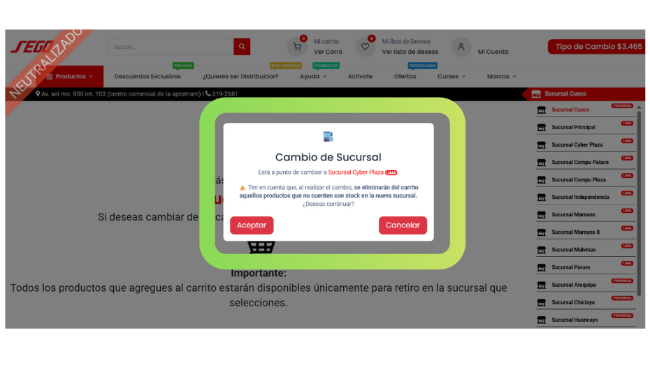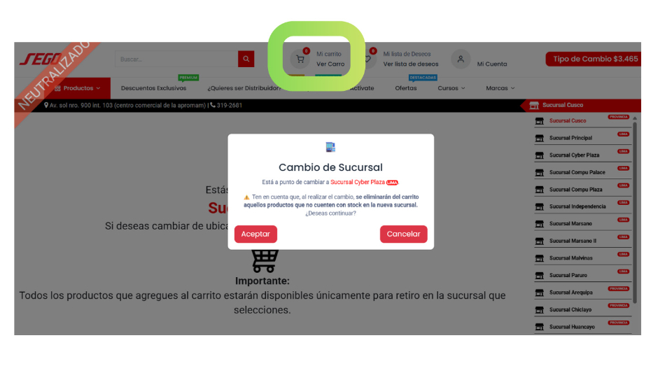 Antes de realizar el cambio de sucursal, debemos leer atentamente las indicaciones, especialmente si ya tenemos productos agregados al carrito de compras.