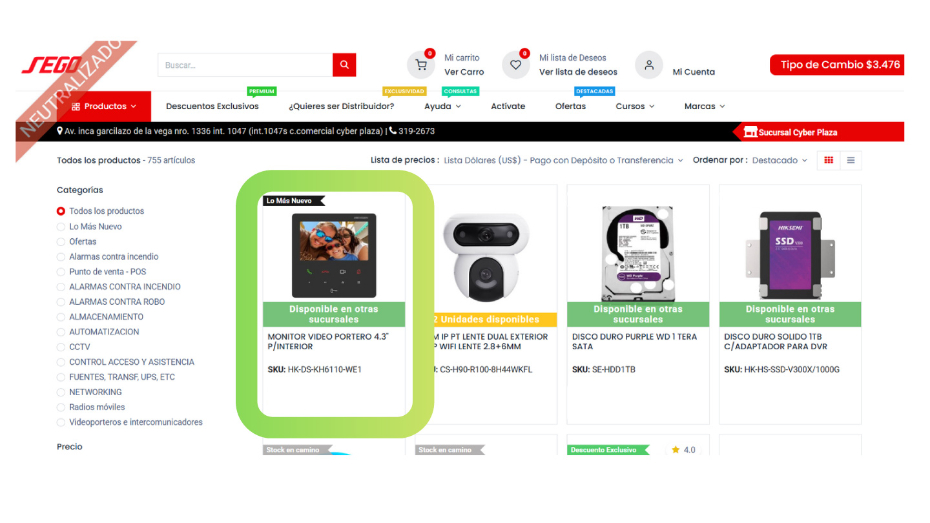 Cuando veamos que un producto tiene una franja verde con el mensaje “Disponible en otras sucursales”, esto significa que no hay stock en la sucursal en la que nos encontramos actualmente, pero sí está disponible en otras sucursales de Lima o provincia.