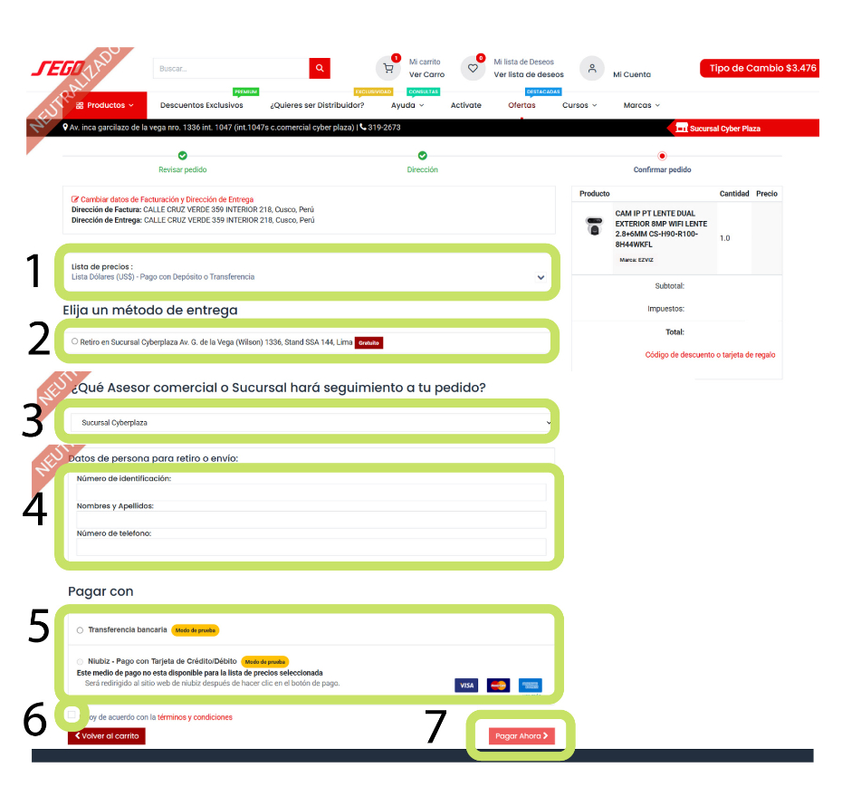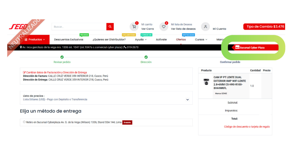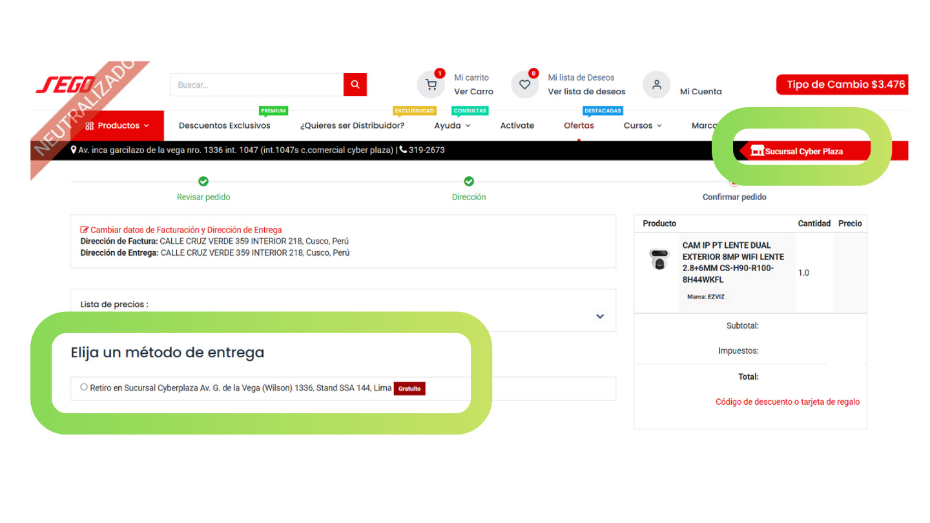 - Marcar la opción de recojo gratuito en tienda, que se habilita automáticamente según la sucursal en la que nos encontramos (en este caso, la Sucursal Cyberplaza).